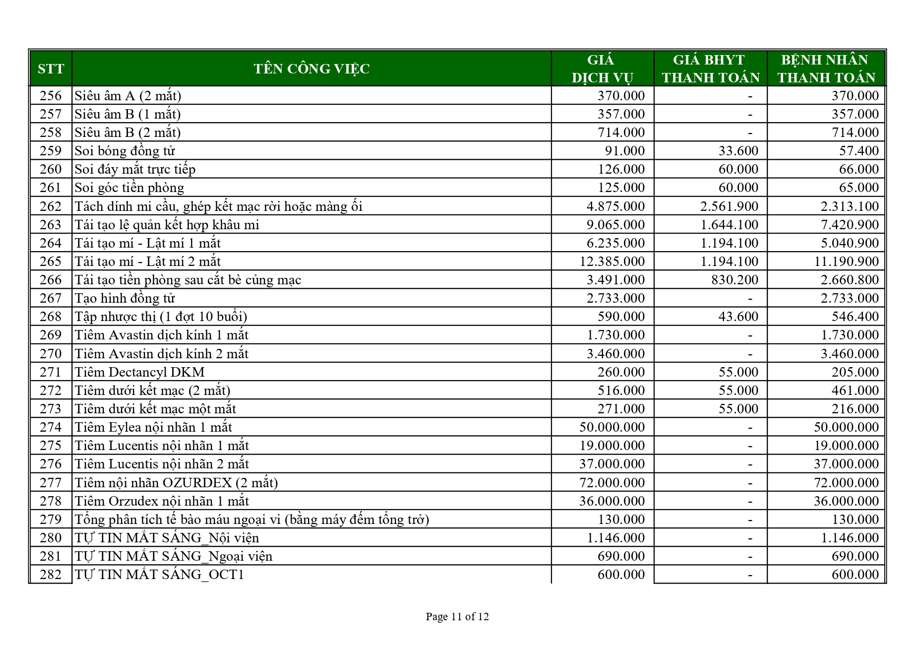 BẢNG GIÁ DỊCH VỤ KHU THƯỜNG
